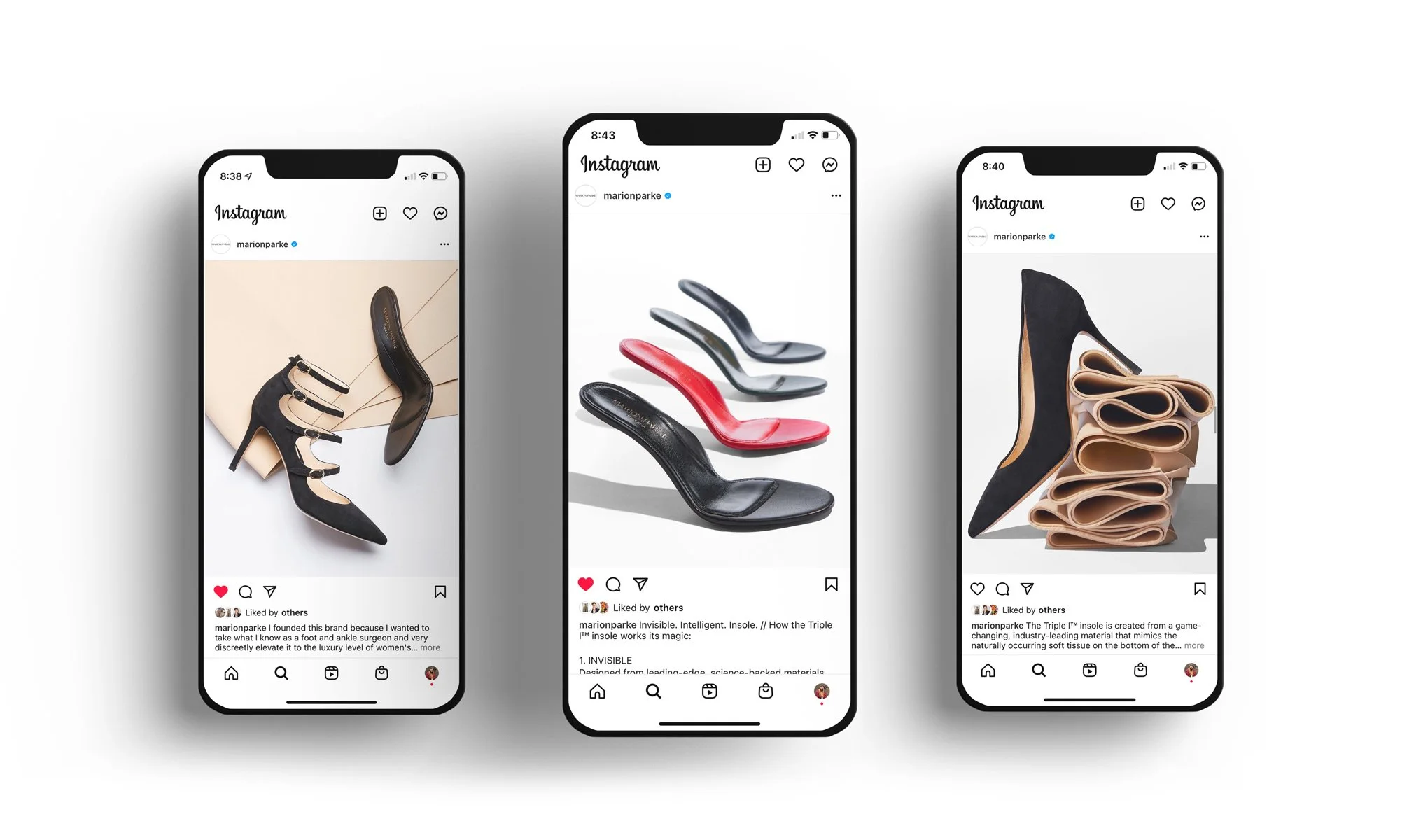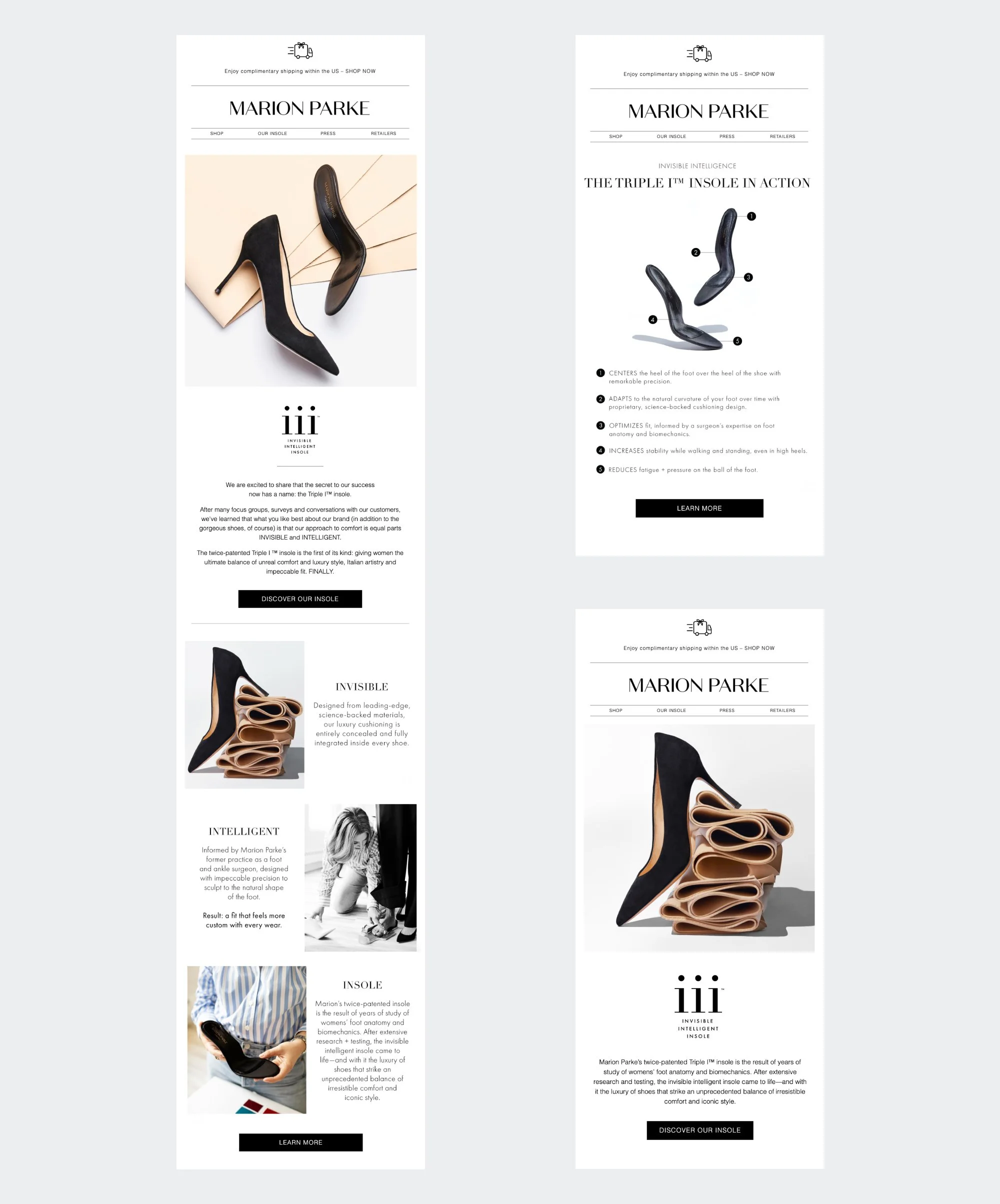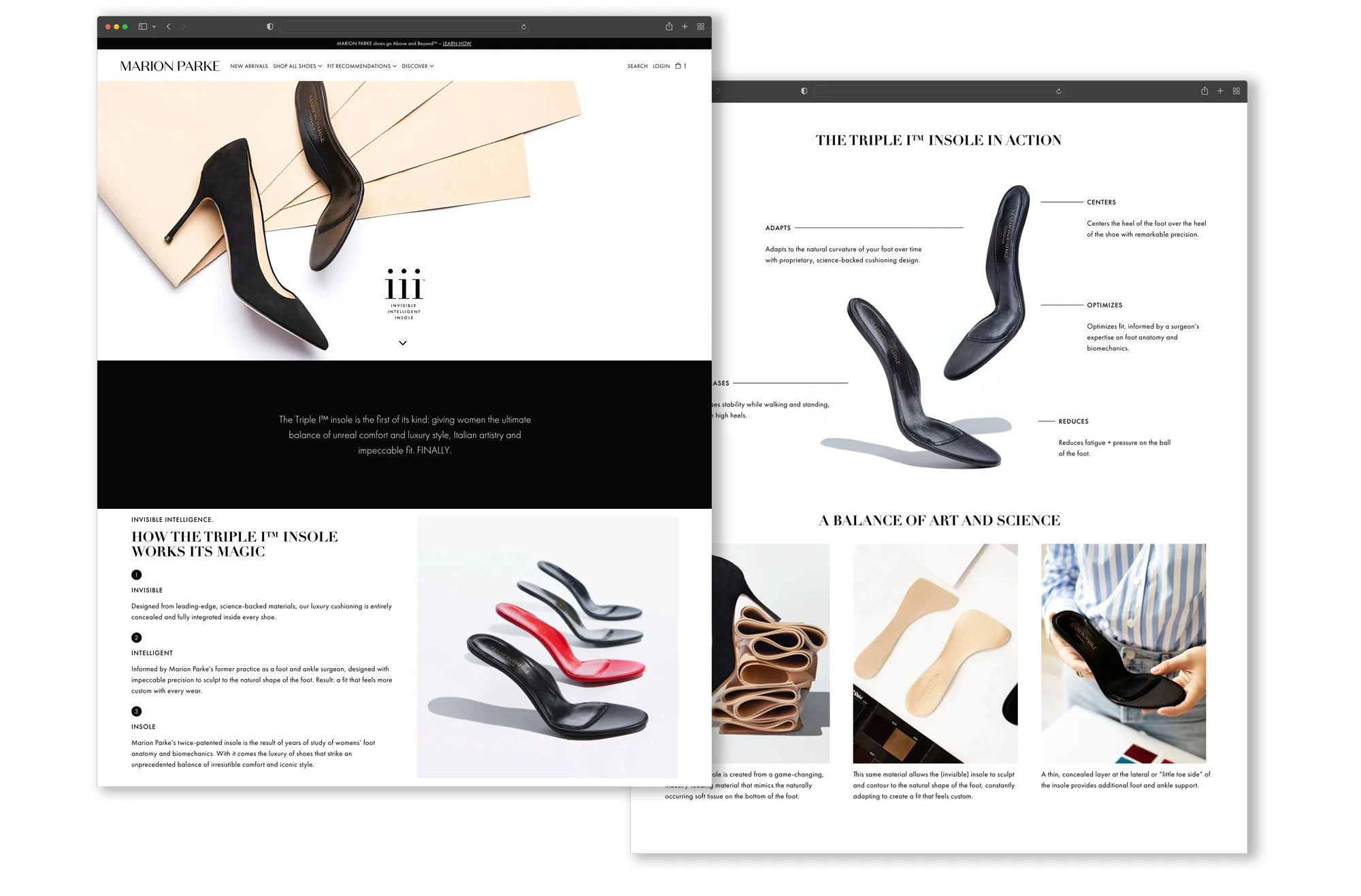 Marion Parke is an American podiatric surgeon turned luxury footwear designer. Every shoe produced seamlessly incorporates her twice-patented insole, named and trademarked the Triple I™ insole. As the art director, I was tasked with producing creative assets to support the launch of the Triple I™ insole webpage and creating a library of images that transcend seasons. We found creative, sculptural ways to incorporate elements of the insole such as the medical grade material used for cushioning. I also oversaw the webpage creation and worked closely with our developers to produce an informative and compelling digital presence on the site.